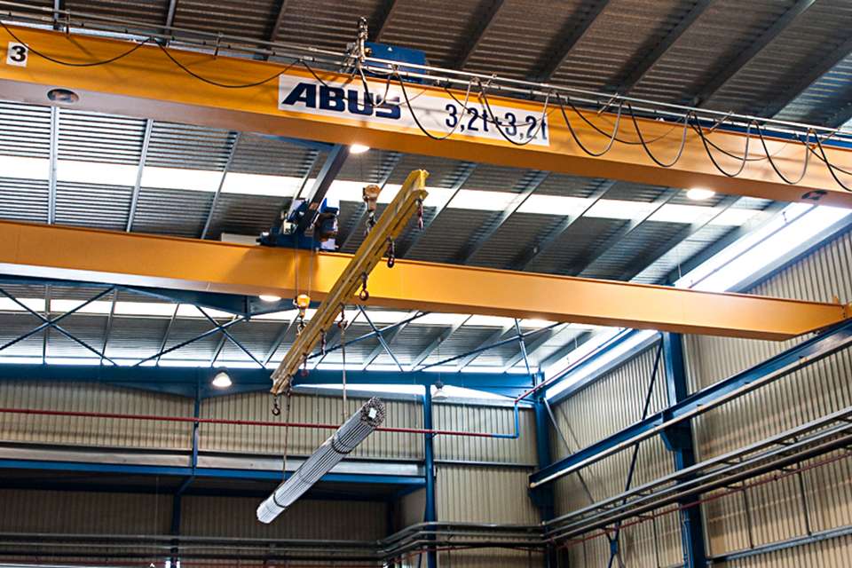 搬運(yùn)這些鋼筋和大捆件需要安裝一些橋式起重機(jī),起重機(jī)需配有兩個(gè)同步運(yùn)行、彼此間隙為4000毫米的吊鉤,并安裝于建筑縱向上,以便處理貨物的搬運(yùn)、存儲(chǔ)和卡車裝卸。ABUS Gréas(www.abusgruas.es)和德國(guó)母公司安博起重設(shè)備有限公司,為這一應(yīng)用設(shè)計(jì)了解決方案:使用數(shù)臺(tái)具有較大端梁的橋式起重機(jī),每臺(tái)起重機(jī)配備一個(gè)小車,小車含兩個(gè)完全基于標(biāo)準(zhǔn)部件設(shè)計(jì)的電動(dòng)葫蘆,以降低成本并實(shí)現(xiàn)最小化維護(hù)。